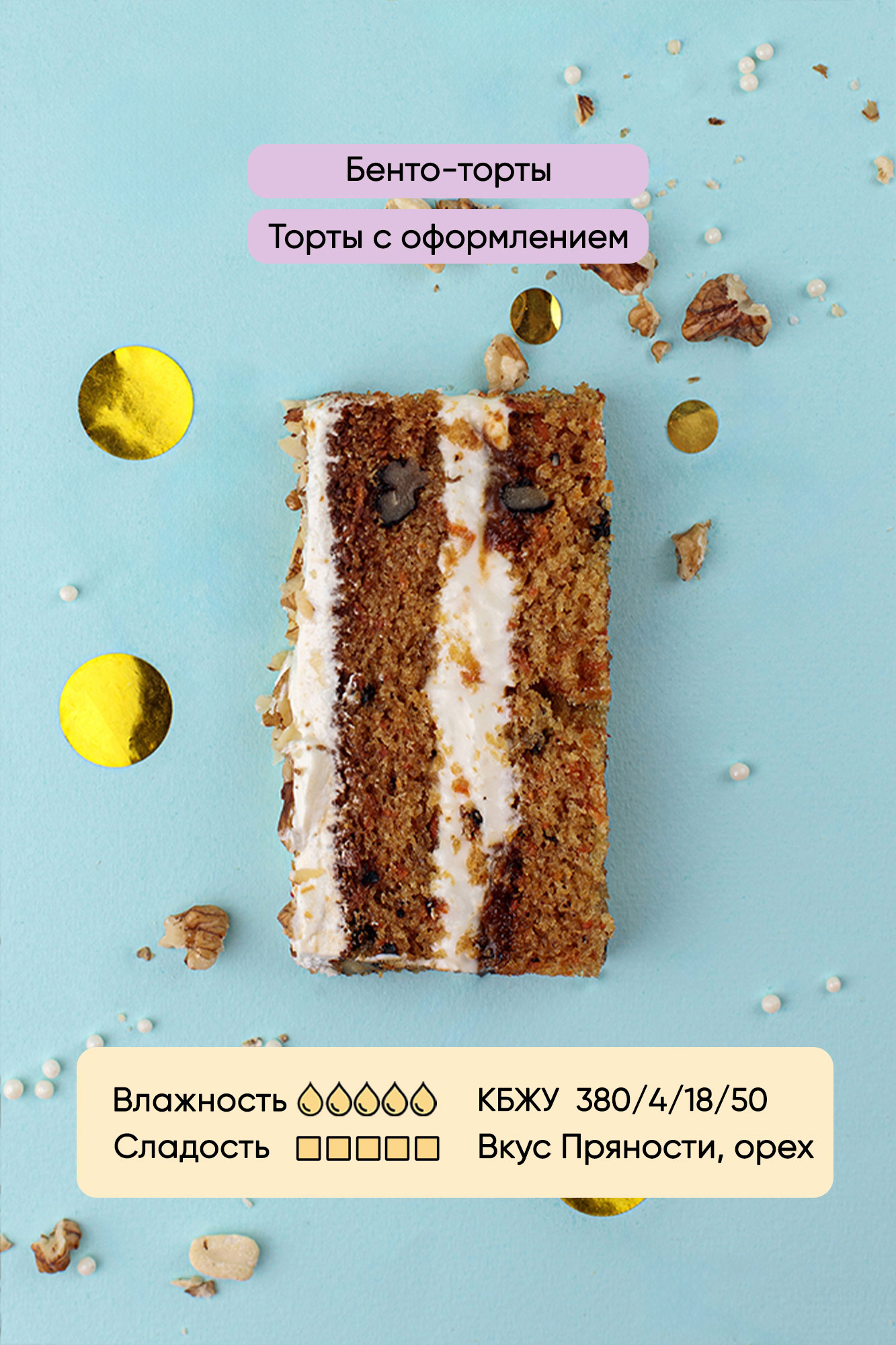 Состав: Мука пшен. вс, яйцо, сахар, масло растит., морковь св., орех грецкий, сода пищ., корица молотая, сыр творожный, масло сливочное, сах. пудра, карамель (сахар, сливки 35%, масло сливочное