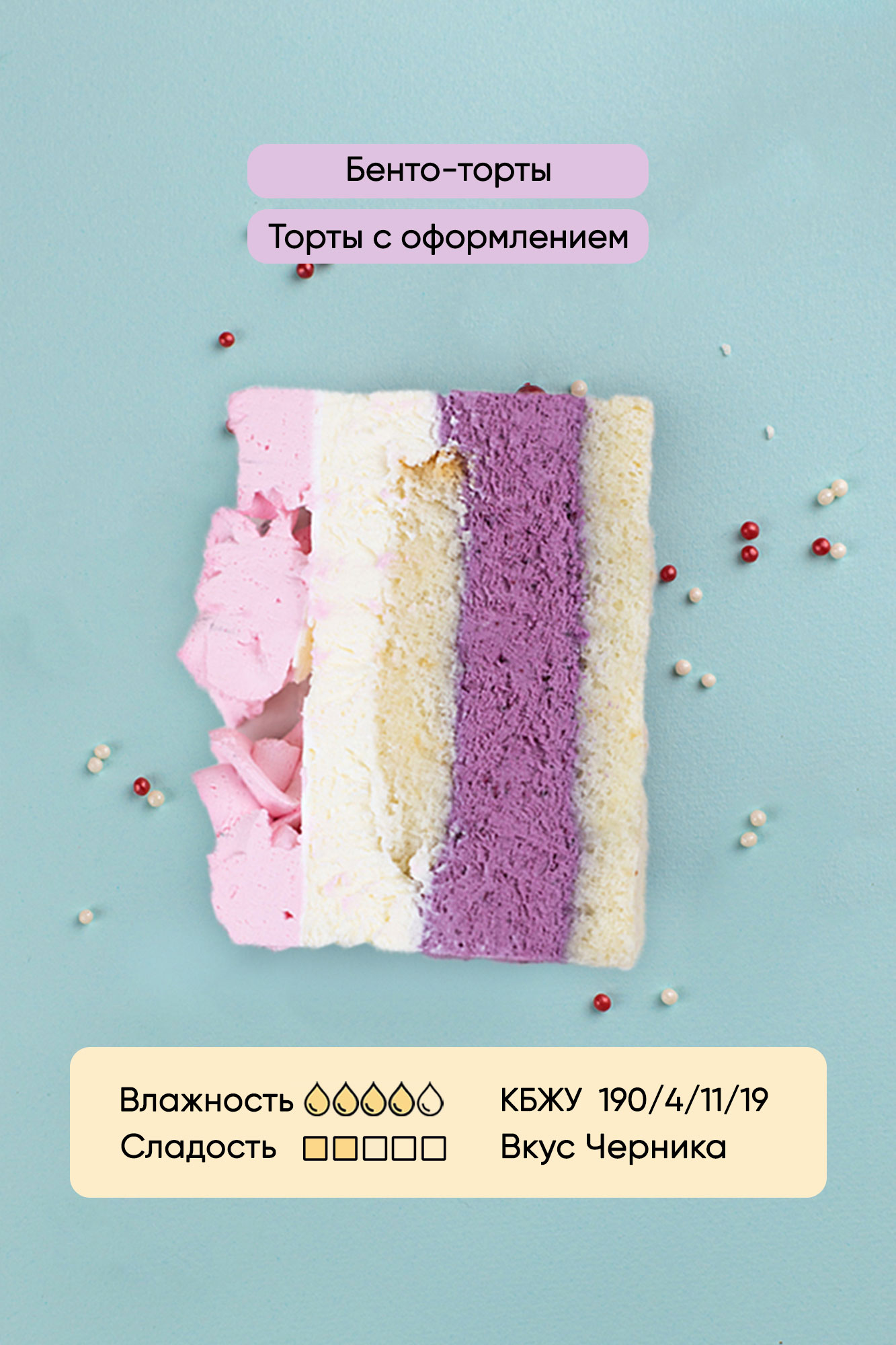 Легкая и изысканная начинка, состоящий из нежного ванильного бисквита, который идеален в сочетании с воздушным черничным муссом и освежающим муссом на основе йогурта. Два мусса дополняют друг друга и порадуют любителей легких и ягодных десертов. Этот торт идеально подойдет для разных поводом и без, за чаепитием или чашечкой кофе!